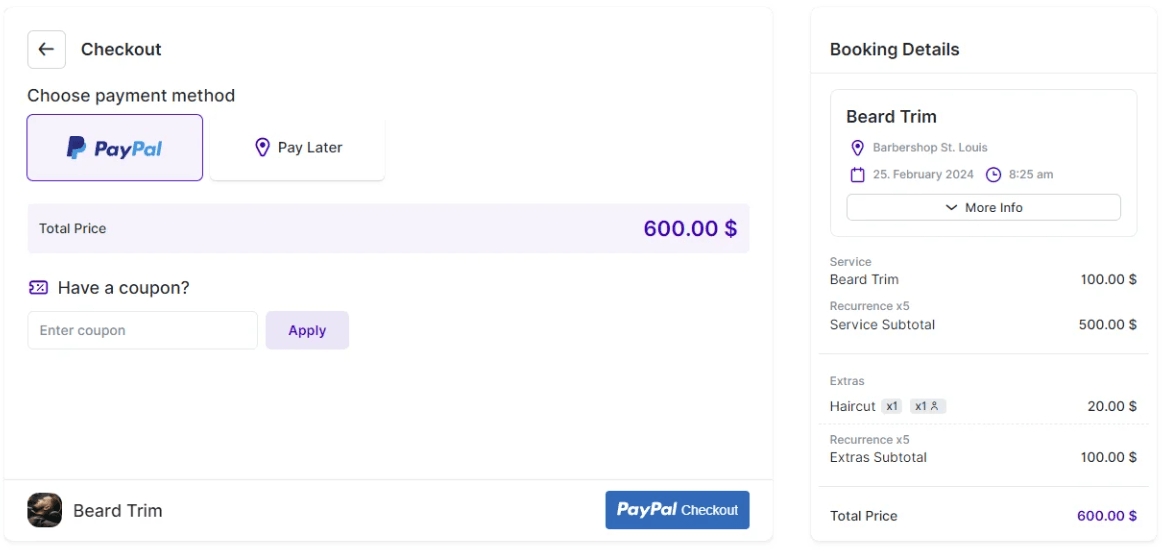 - You can also configure how payments for Recurring Appointments will be handled. You have the option to require customers to pay for all appointments in the recurring cycle upfront when the first appointment is booked. Alternatively, customers can pay for only the first appointment and then settle the remaining payments either on-site or through the “Payment via Link” feature, which allows for secure online payments.