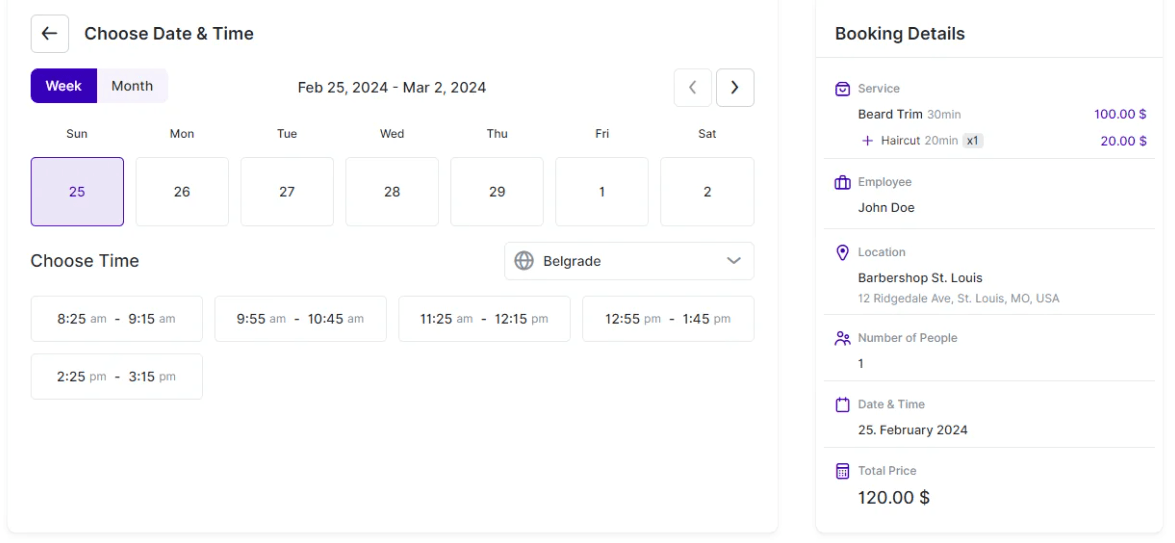In this example, it’s the Date & Time selection. By default, the first available week when the selected employee is available is shown, and below it, the available times for the selected date are displayed. Your customers can cycle through weeks by using the < and > arrows for navigation above the dates. Additionally, they can switch to the Monthly view if they need to select a date further in the future.