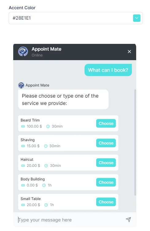 - Online Payments: Currently, the Chatbot does not support processing online payments for appointments. Customers will need to pay for their bookings using alternative methods, such as in-person payments or other online payment options available on your website.