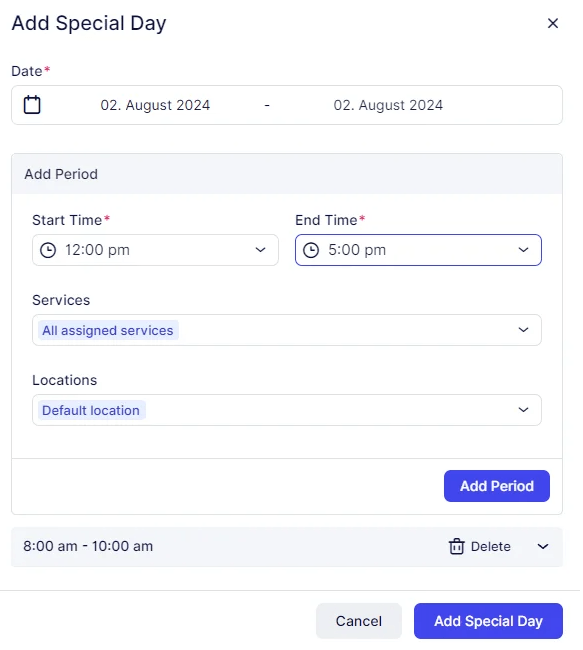 After adding the first period, such as 08:00 to 10:00, proceed to add the next period, like 12:00 to 17:00. Click on Add Period again if there are additional time slots needed. Once all the necessary periods are added, click on Add Special Day to save the entire schedule. It is crucial to remember to click Add Period for each new time slot; otherwise, the Special Day will be saved with only the first period included